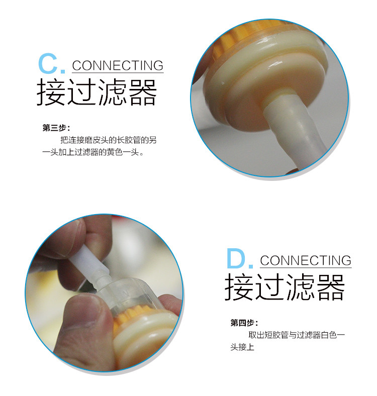3. añada el otro extremo de la manguera larga que conecta la extremidad abrasiva con el extremo amarillo del filtro