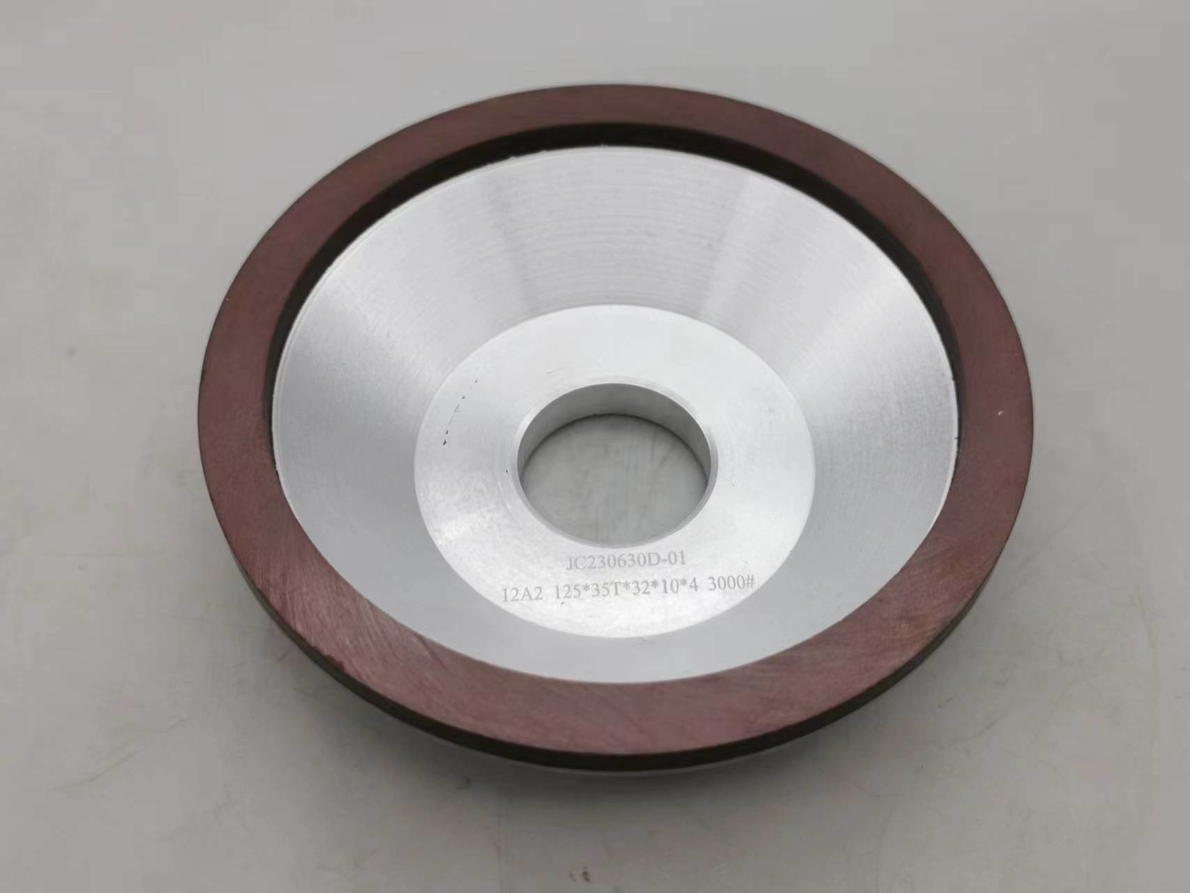 JC 12A2 Roda de molienda de fijación de resina, hecha en China. Tiene un cuerpo de aluminio con un agujero interior de 32, y un grosor de 35.Es perfectamente adecuado para aplicaciones de molienda de resina.